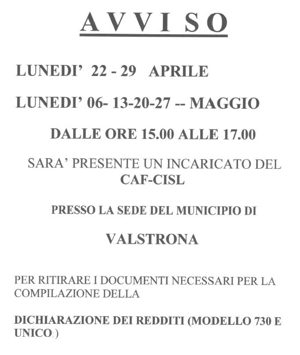 Pubblichiamo in allegato la locandina con i giorni e gli orari di presenza, presso la ex sala esposizioni degli artigiani, del Comune di Valstrona dell'incaricato del CAF-CISL che ormai come da tradizione sarà presente per raccogliere i documenti necessari alla dichiarazione dei redditi 730 dei residenti che vogliono utilizzare il servizio.