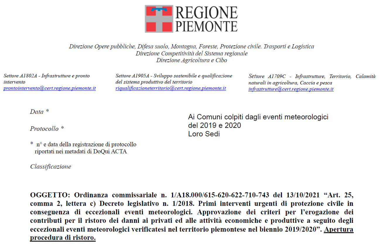 Approvazione dei criteri per l'erogazione dei contributi per il ristoro dei danni ai privati ed alle attività economiche e produttive a seguito degli eccezionali eventi meteorologici verificatesi nel territorio piemontese nel biennio 2019/2020. Apertura procedura di ristoro.