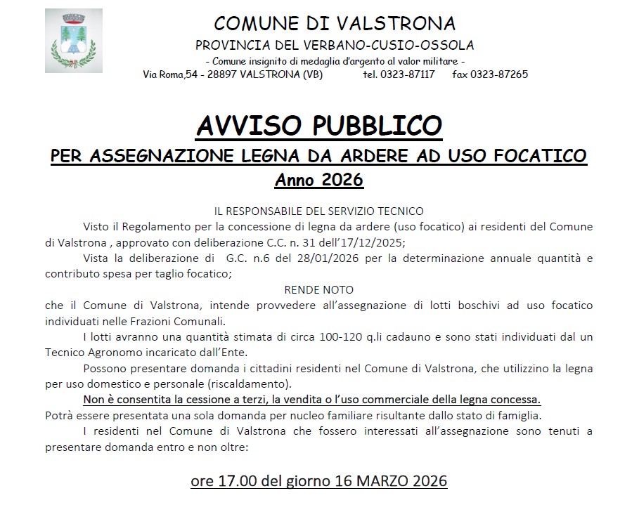 Visto il Regolamento per la concessione di legna da ardere (uso focatico) ai residenti del Comune di Valstrona, approvato con deliberazione C.C. n. 31 dell’17/12/2025;