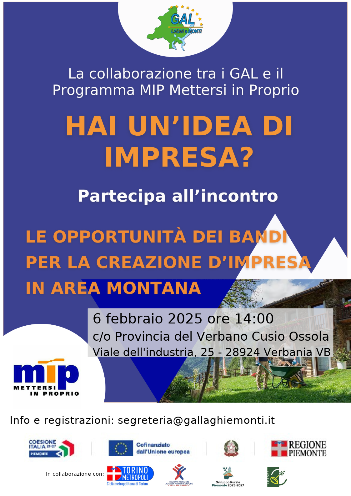 Il programma MIP - Mettersi in Proprio (Servizio Antispam ha rilevato un possibile tentativo di phishing da "gallaghiemonti.us15.list-manage.com" www.mettersinproprio.it), un'iniziativa regionale che offre servizi di accompagnamento gratuiti per trasformare la tua idea imprenditoriale in un progetto concreto. Il programma MIP fornisce supporto attraverso percorsi di assistenza personalizzata, consulenza specialistica, e tutoraggio. I servizi MIP includono l'aiuto nella stesura del business plan, un documento fondamentale per la valutazione di fattibilità del progetto imprenditoriale e un requisito obbligatorio per concorrere al bando GAL SRE04.