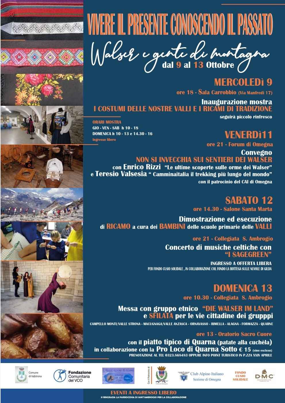Dal 9 al 13 ottobre, ad Omegna, si terrà “Vivere il presente conoscendo il passato”, un ciclo di eventi organizzato dall’Associazione “La Bottega sulle nuvole di Gilda”, con il patrocinio del Comune di Omegna e del Comune di Valstrona, per dare lustro alla gente di montagna ed ai Walser.