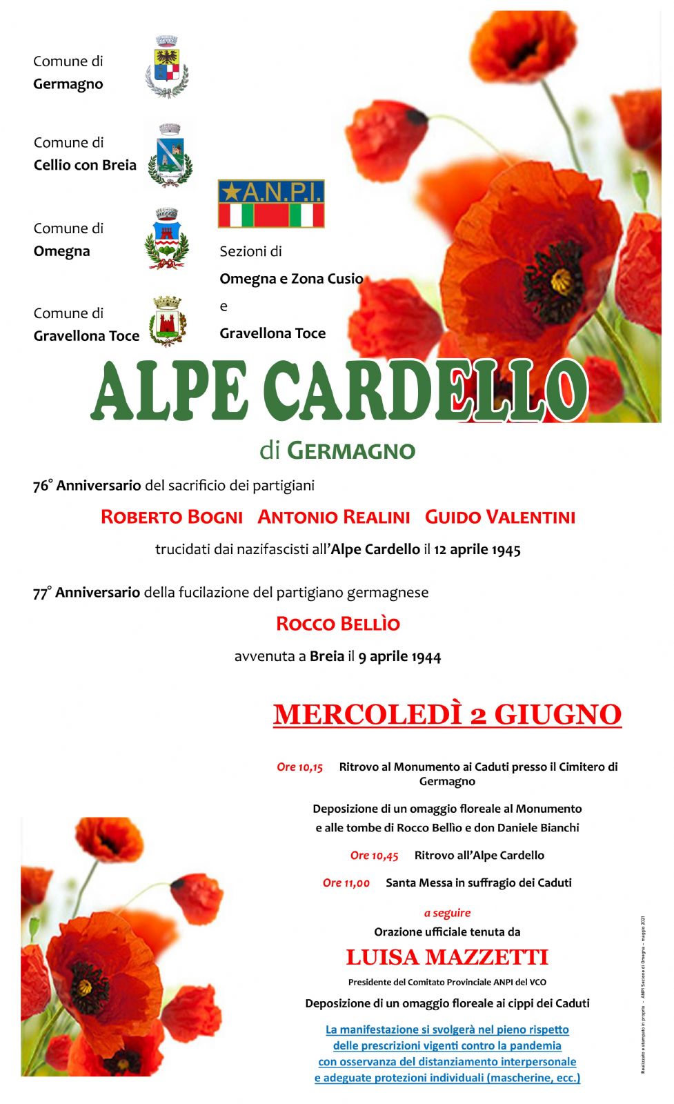 Per opportuna conoscenza - e nella speranza di poterVi annoverare tra i graditi ospiti - in allegato la locandina relativa alla Commemorazione che si terrà mercoledì 02.06.2021 presso il Cimitero di Germagno e l'Alpe Cardello.