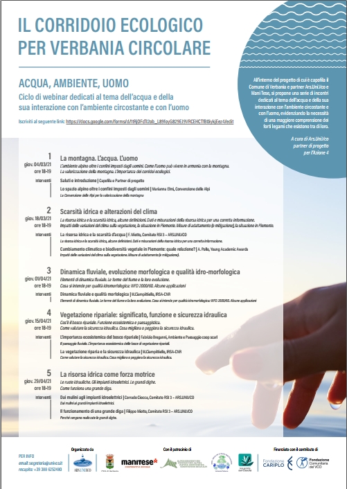 In allegato la locandina e la scheda per chi volesse iscriversi (è tutto gratuito), di una prima serie di seminari dedicati al tema dell’acqua e della sua interazione con l’ambiente circostante e con l’uomo. Con questo ciclo di seminari vorremmo che si sviluppasse una corretta gestione dei rapporti che si possono creare e che possono garantire un corretto sviluppo delle attività produttive dell’uomo, il recupero di ambienti naturali compromessi nonché la loro salvaguardia, introducendo quindi il concetto di patrimonio naturale e dell’umanità.