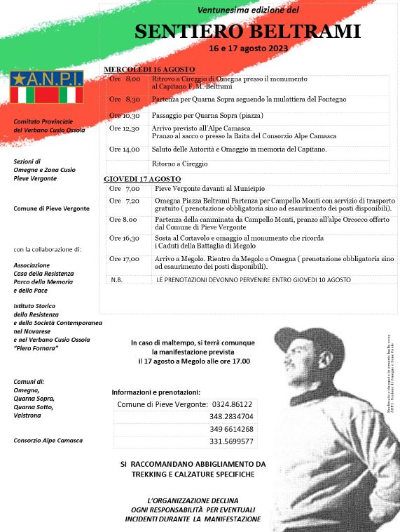 Programma della 21° edizione del Sentiero Beltrami, camminata aperta a tutti sui sentieri percorsi dal Capitano e dai suoi partigiani, che si terrà nei giorni 16 e 17 agosto 2023.