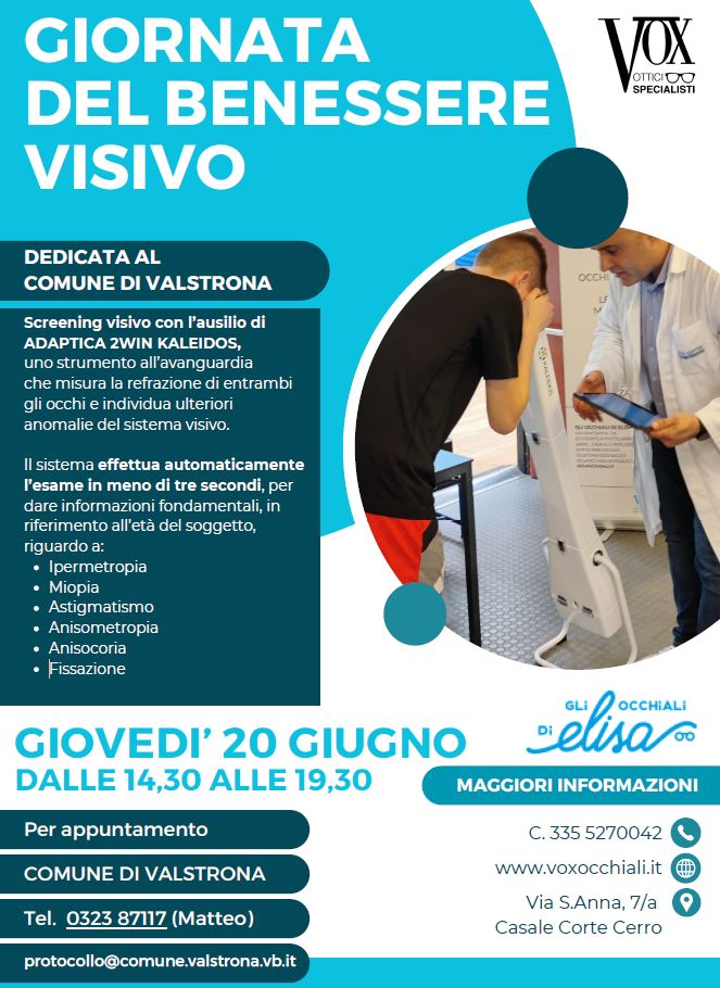 Giornata del benessere visivo dedicata al Comune di Valstrona Giovedì 20 Giugno dalle ore 14.30 alle 19.30 presso la sede comunale di Strona.